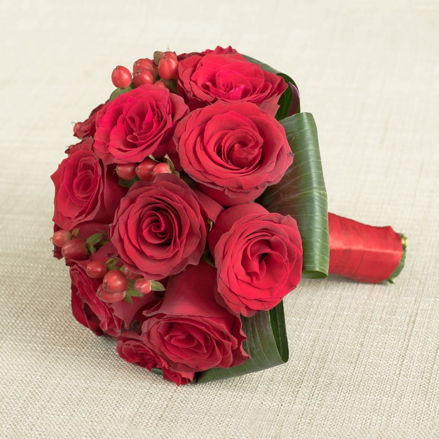 Our Bridal Bouquet Royal Essence is a vibrant celebration of love and beauty. Designed with precision, this luxurious bouquet features hand-selected, fresh deep scarlet roses, dynamic red hypericum, and elegantly arranged aspidistra green leaves. Each element of the bouquet is carefully chosen to ensure unmatched quality and aesthetic appeal.